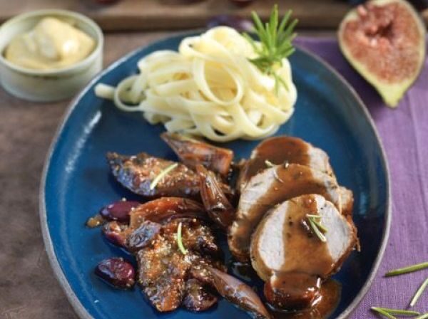 Placer le filet dans un plat à four et verser toute la marinade dessus. Disposer autour les échalotes, les raisins et les figues. Verser un filet d’eau au fond du plat.