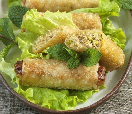6- Réchauffer l’huile de nouveau et faire frire les nems une deuxième fois, 4 à 5 min.,pour qu’ils soient bien croustillants. Déguster les nems chauds, accompagnés des feuilles de salade, de menthe et de la sauce nems.